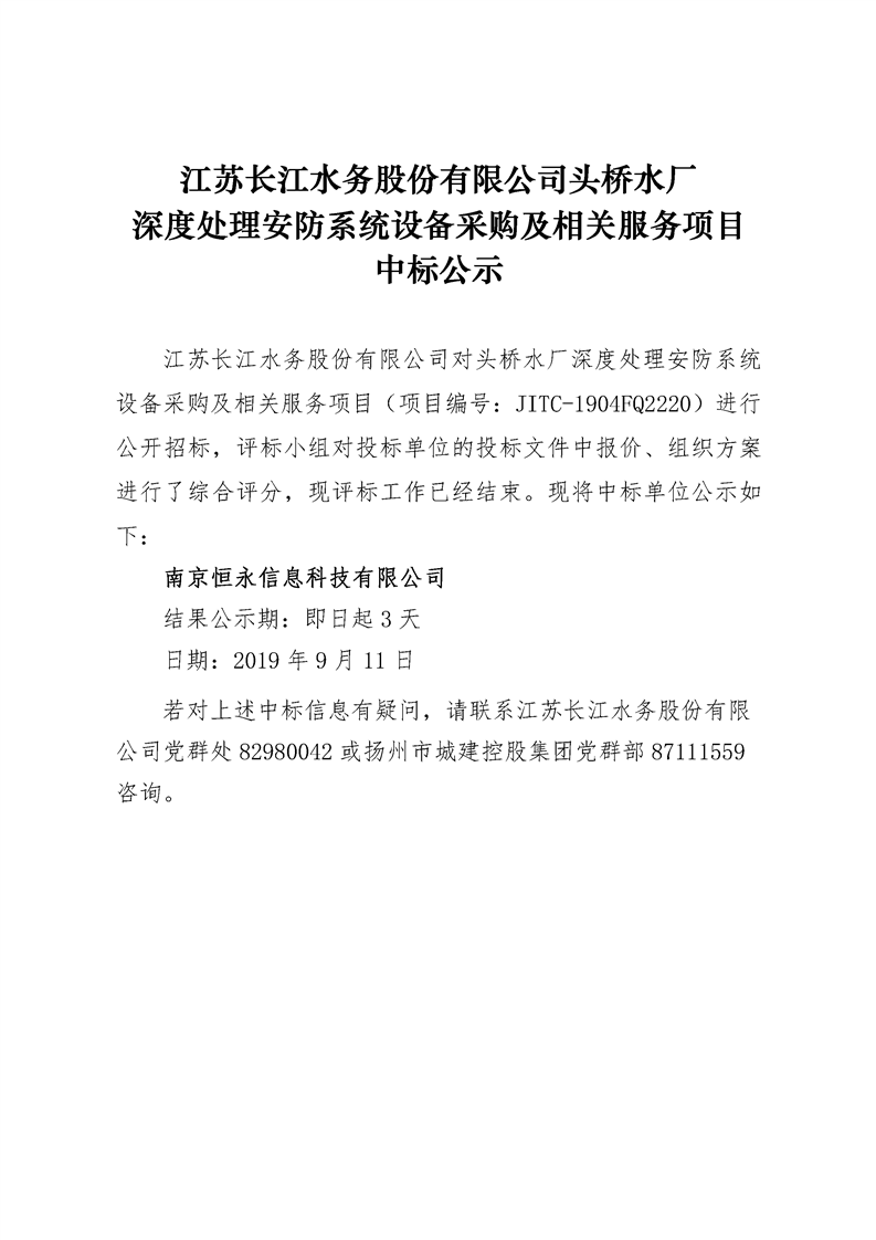 江蘇長江水務股份有限公司頭橋水廠深度處理安防系統設備采購及相關服務項目中標公示