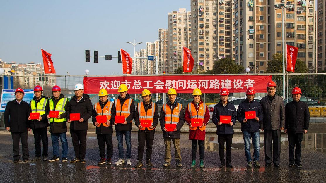 在新春佳節(jié)即將到來(lái)之際,1月19日上午,市總工會(huì)副主席戚安寶帶隊(duì)來(lái)到運(yùn)河路快速化改造工程項(xiàng)目部,親切慰問(wèn)了一線施工人員,并為他們送上了新春的祝福。城控集團(tuán)副總經(jīng)理季紅軍、工會(huì)主席張正斌參加了慰問(wèn)。