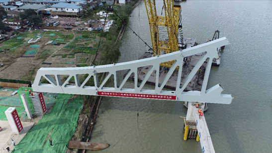 9月26日下午,萬福快速路跨京杭運(yùn)河大橋首片鋼桁架吊裝成功,打響了大橋上部結(jié)構(gòu)施工的第一槍。