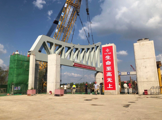 鋼桁架安裝是大橋整個(gè)施工過程中施工難度最大、技術(shù)要求最高的環(huán)節(jié),項(xiàng)目部從構(gòu)件進(jìn)場、吊裝、精準(zhǔn)定位,每一道工序、環(huán)節(jié)都實(shí)行全過程、無縫隙的標(biāo)準(zhǔn)化管理,全力確保安裝和細(xì)節(jié)滿足技術(shù)要求。為確保首節(jié)鋼桁架吊裝工作有序開展,項(xiàng)目部成立了專項(xiàng)施工領(lǐng)導(dǎo)小組,多次組織召開籌備會(huì)并進(jìn)行吊裝試驗(yàn)。由于吊裝施工是在繁忙的運(yùn)河Ⅱ級(jí)航道,航道運(yùn)輸船舶眾多,為確保航道安全,項(xiàng)目部多次與地方海事協(xié)調(diào),提前發(fā)布封航通告,吊裝過程實(shí)施水上臨時(shí)交通管制,為安全順利吊裝提供了堅(jiān)實(shí)保障。