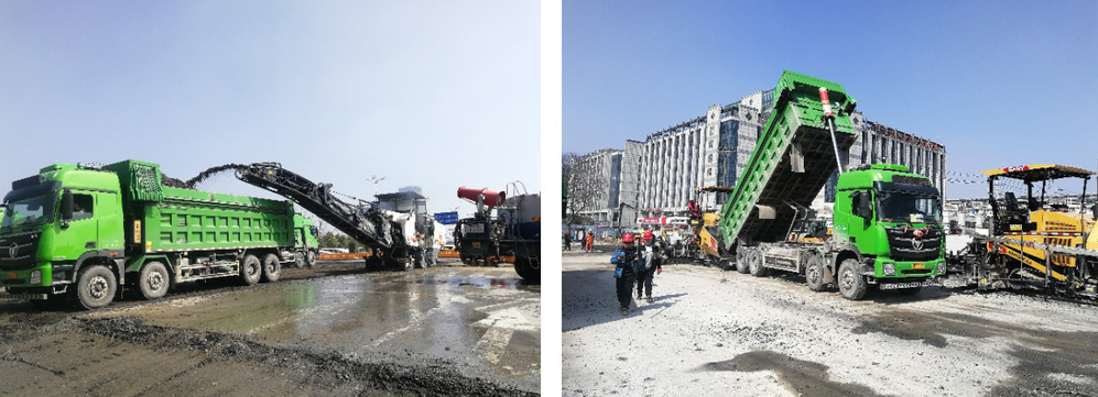 此次交通導(dǎo)改施工分為老路面銑刨與水穩(wěn)基層攤鋪、瀝青面層攤鋪、畫道路標(biāo)線和安裝護(hù)欄圍擋三個(gè)階段。