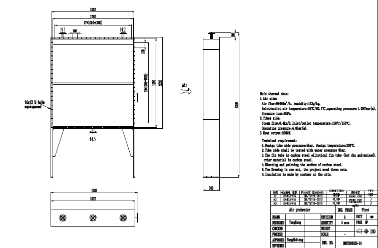 對每條線的現(xiàn)有預(yù)加熱器進(jìn)行改造,根據(jù)現(xiàn)有尺寸、接口改造為蒸汽、空氣換熱的管殼換熱器,預(yù)加熱器改造圖如圖4:
