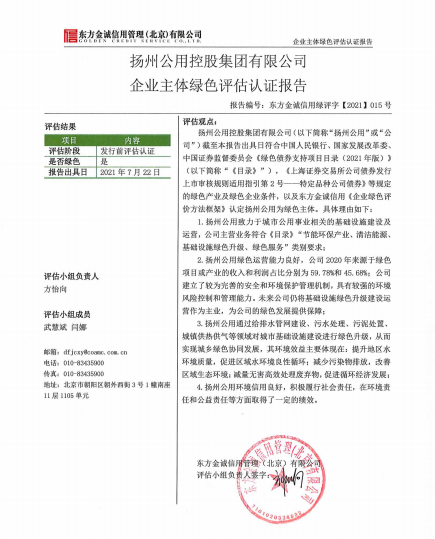 根據(jù)評估結(jié)果,東方金誠確認(rèn)揚州公用控股的綠色業(yè)務(wù)符合國家發(fā)展改革委等七部門發(fā)布的《綠色產(chǎn)業(yè)指導(dǎo)目錄(2019年版)》和人民銀行等三部門發(fā)布的《綠色債券支持項目目錄(2021年版)》要求,公司經(jīng)營的環(huán)境表現(xiàn)、社會表現(xiàn)和公司治理的綜合綠色化程度較高。