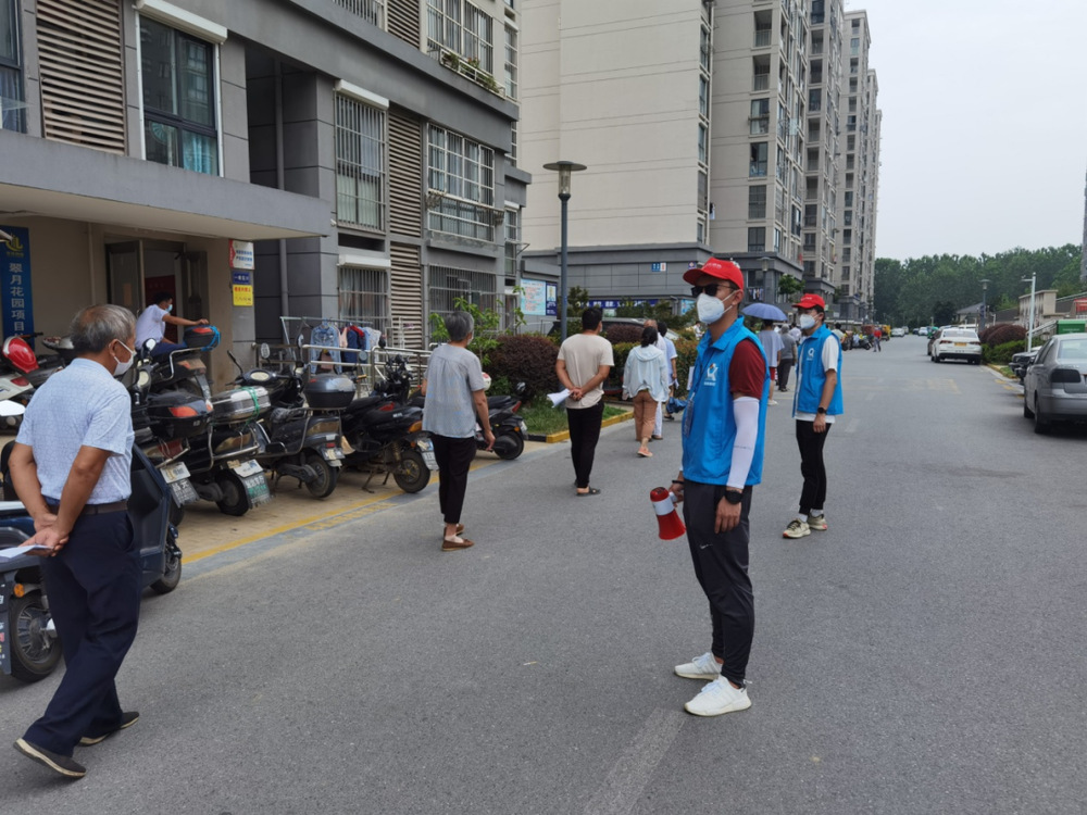 “請(qǐng)大家排好隊(duì),保持一米以上安全距離,不要造成人員聚集,請(qǐng)?zhí)崆皽?zhǔn)備好你的身份證……”志愿者不斷提醒居民注意。在翠月花園核酸采集點(diǎn),志愿者們穿梭在排隊(duì)人群中,邊安撫居民緊張情緒,邊引導(dǎo)居民即測(cè)即走?!半m然天氣很悶熱,工作量很大,但是我們有信心能保質(zhì)保量完成全小區(qū)核酸檢測(cè)任務(wù)?!彼麄儾活櫤韲邓粏?,依舊熱情且耐心地回答居民的問題,引導(dǎo)現(xiàn)場(chǎng)秩序。11日下午,雨淅淅瀝瀝下個(gè)不停。雖然避雨棚近在咫尺,但志愿者們面對(duì)風(fēng)雨寸步不離崗位,他們笑著說道“這點(diǎn)風(fēng)雨算啥呀?”一周來,志愿者們協(xié)助社區(qū)開展了4次核酸檢測(cè),共檢測(cè)居民約12000人次。