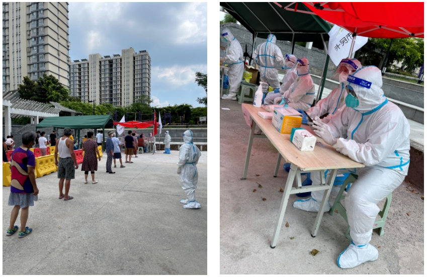 志愿者的臉龐遮掩在面罩與口罩下,身形隱藏于防護服和藍馬甲里,面對炎炎酷暑與疫情防控的雙重“烤”驗,化身居民“汗”衛(wèi)者,守好社區(qū)“安全線”。8月7日,志愿者服務(wù)隊接到支援廣?;▓@廣欣苑輔助核酸檢測、協(xié)助物資采購的任務(wù)。自此后的10天中,他們輔助該封閉小區(qū)開展核酸檢測,做好逐樓通知并維護核酸檢測點秩序,至今累計服務(wù)7次核酸檢測。他們還協(xié)助社區(qū)完成所轄區(qū)域內(nèi)居民信息核對,值守小區(qū)出入口,嚴格查驗體溫和“兩碼”,并幫助社區(qū)做好居民生活物資的預訂、采購和配送。