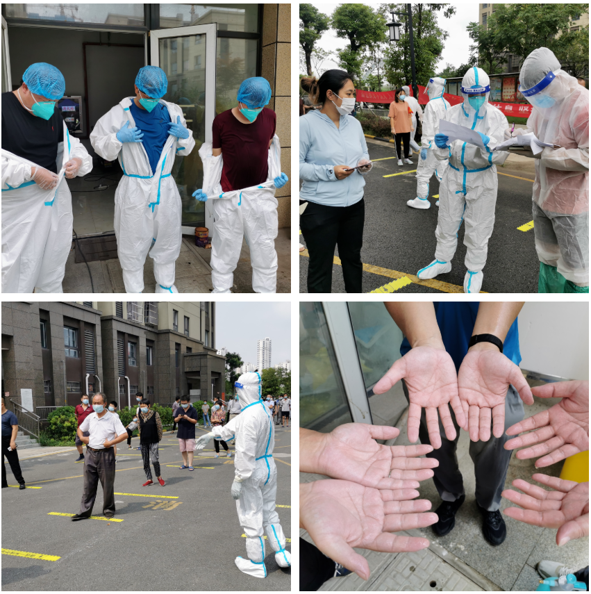 “幫我對照下防護服穿戴教學視頻,順序?qū)Σ粚??全部保護了沒有?”這是志愿者首次穿戴全套防護用具時忐忑的話語。初次接觸防護服,雖然前期教學培訓過,但內(nèi)心期待中還有些許緊張,動作生疏卻很仔細,大家相互幫忙、相互學習、相互監(jiān)督,確保不留任何漏洞,檢測過程中,大家要做好測量體溫、核對人員信息、核查健康碼、提醒保持安全距離、幫助老弱病殘及特殊人群等工作,有時還要應(yīng)對暈厥的居民、易怒的群眾情緒以及少部分特殊群體的交流障礙,一次核酸檢測的時間大概在3小時左右,這樣高強度的工作環(huán)境,大家沒有任何怨言,除去防護服的那一刻,看著臉上深深的勒痕、滴水的上衣和發(fā)白的雙手,有的只是相視一笑,再次投身到小區(qū)封控管理工作中去。