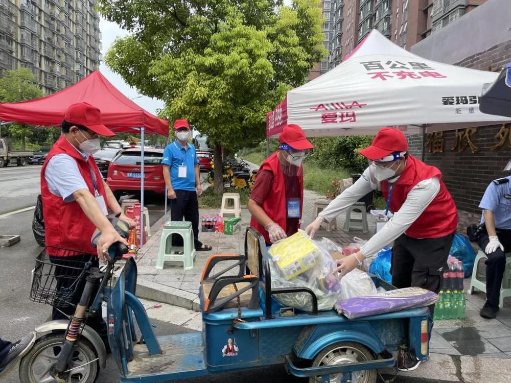 (綜合辦公室周易,在萬福社區(qū)幫助小區(qū)居民進(jìn)行物資幫送,牢記時(shí)刻保持1米線安全距離)