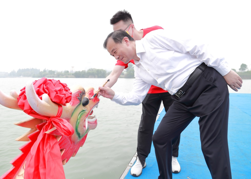 龍舟賽活動現(xiàn)場,葉善祥為每艘賽船龍頭進(jìn)行了點睛后,宣布龍舟賽正式開賽。哨聲響、鼓點起,3支龍舟隊在水面同時競發(fā),選手們各司其職,精神抖擻,整齊劃一的揮動手中的船槳破浪前行。親友團(tuán)在岸邊搖旗吶喊、歡呼鼓掌,湖面浪花飛濺,十分壯觀。經(jīng)過訓(xùn)練賽、250米競速賽,最終三只龍舟都齊心協(xié)力抵達(dá)終點,角逐出了一二三名,集團(tuán)領(lǐng)導(dǎo)為獲獎的各支隊伍頒獎。