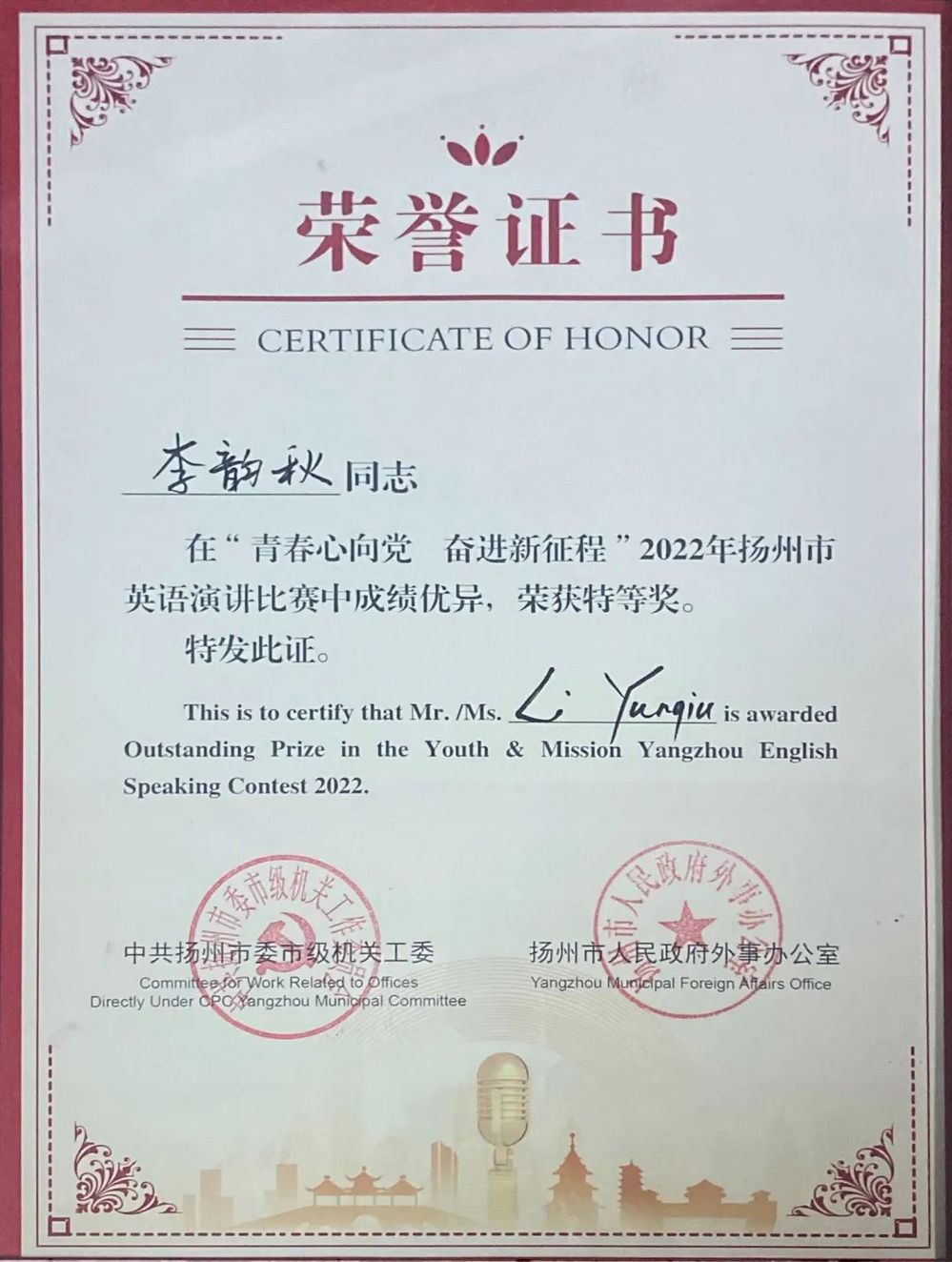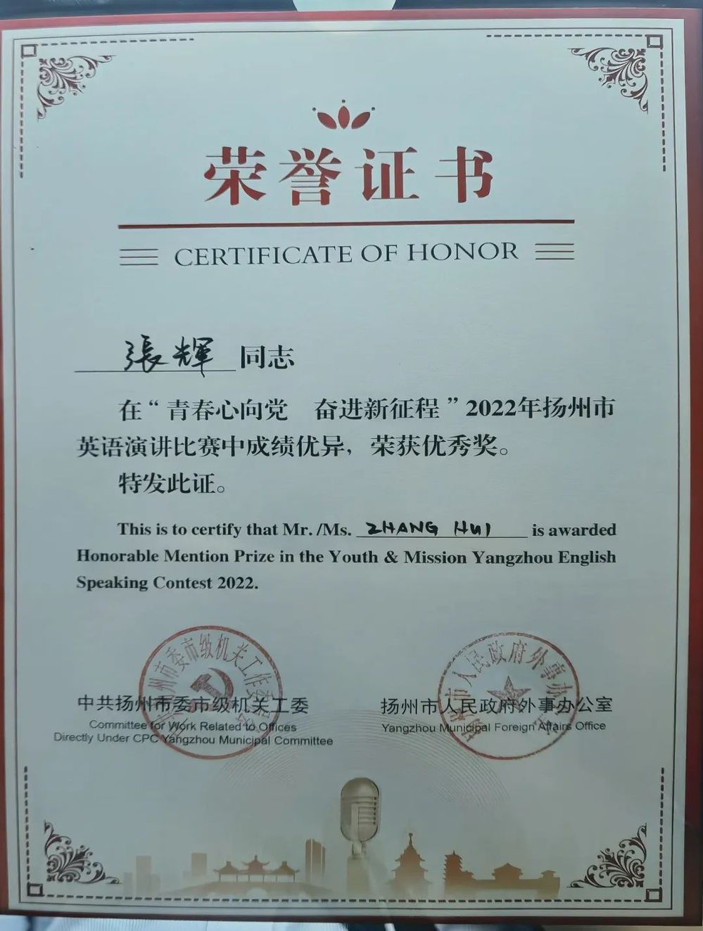 8月20日上午,在揚州市委市級機關(guān)工委與揚州市人民政府外事辦公室聯(lián)合舉辦的“青春心向黨,奮進(jìn)新征程”2022年揚州市英語演講比賽決賽中,城控集團本部李韻秋同志和建盛公司張輝同志分別榮獲特等獎和優(yōu)秀獎。