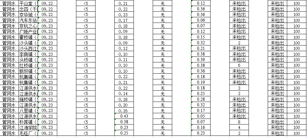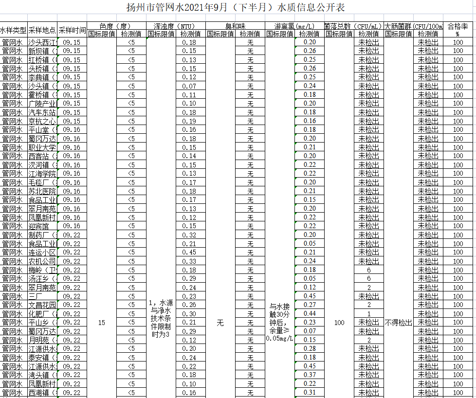 揚(yáng)州市管網(wǎng)水2021年9月(下半月)水質(zhì)信息公開(kāi)表