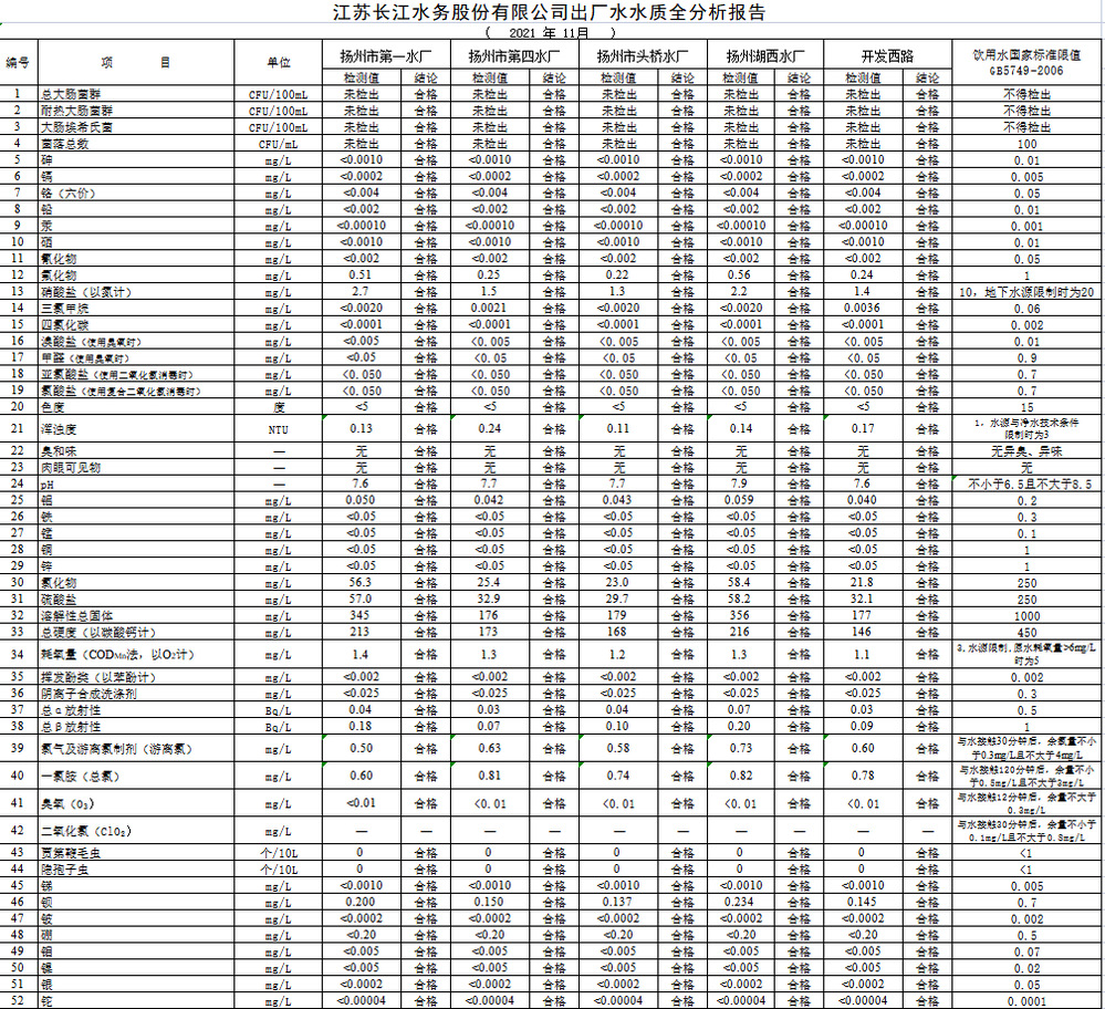 江蘇長江水務(wù)股份有限公司出廠水水質(zhì)全分析報告 (2021年11月)