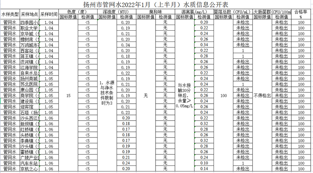 揚州市管網水2022年1月(上半月)水質信息公開表