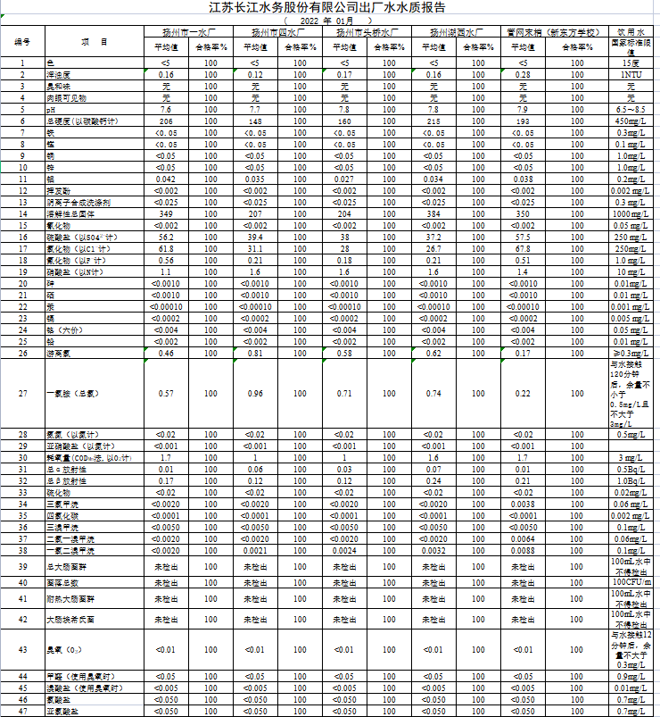 江蘇長江水務股份有限公司出廠水水質(zhì)報告(2022年3月)