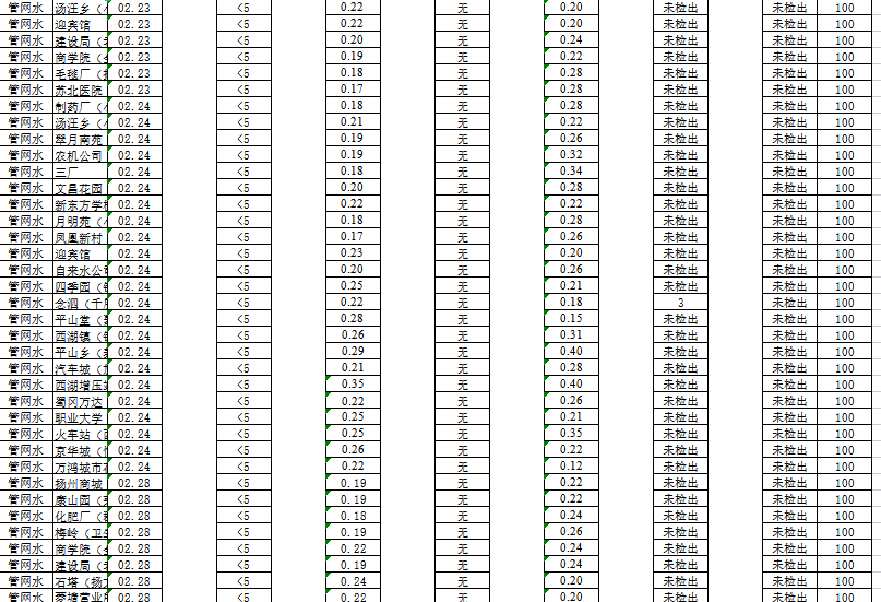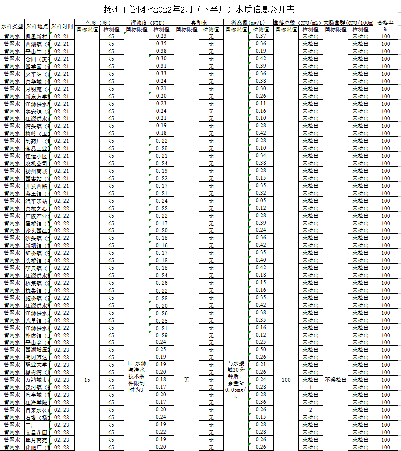 揚(yáng)州市管網(wǎng)水2022年2月(下半月)水質(zhì)信息公開表