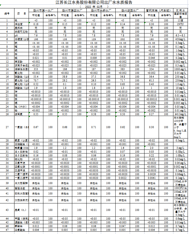 江蘇長江水務(wù)股份有限公司出廠水水質(zhì)報告 ( 2022 年 02月 )