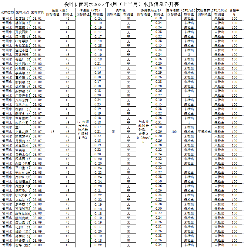 揚州市管網(wǎng)水2022年3月(上半月)水質信息公開表
