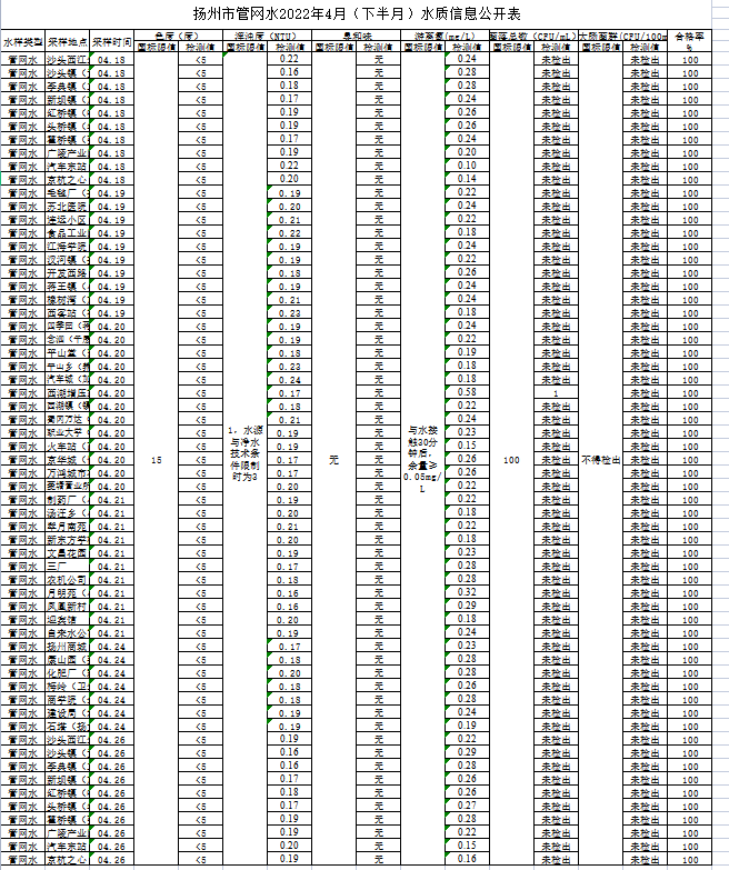 揚(yáng)州市管網(wǎng)水2022年4月(下半月)水質(zhì)信息公開表