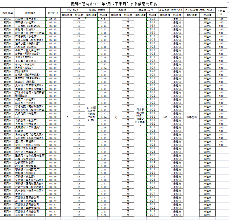 揚(yáng)州市管網(wǎng)水2022年7月(下半月)水質(zhì)信息公開(kāi)表