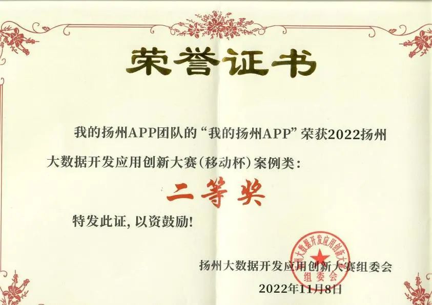 數(shù)據(jù)浪潮涌,揚帆正當(dāng)時。11月8日上午,由揚州市政府辦公室(大數(shù)據(jù)管理局)、揚州市工業(yè)和信息化局聯(lián)合主辦,中國移動揚州分公司承辦的2022移動杯揚州大數(shù)據(jù)開發(fā)應(yīng)用創(chuàng)新大賽頒獎儀式順利舉行,“我的揚州APP”獲大賽案例類賽道二等獎。