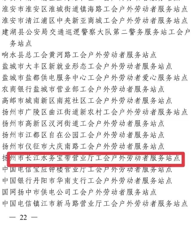 近日,中華全國總工會辦公廳發(fā)布2022年“最美工會戶外勞動者服務站點”名單,城控集團公用事業(yè)服務中心——長江水務寶帶營業(yè)廳工會戶外勞動者服務站點名列其中,這是揚州市總工會建設產業(yè)系統唯一一家入選的服務站點。