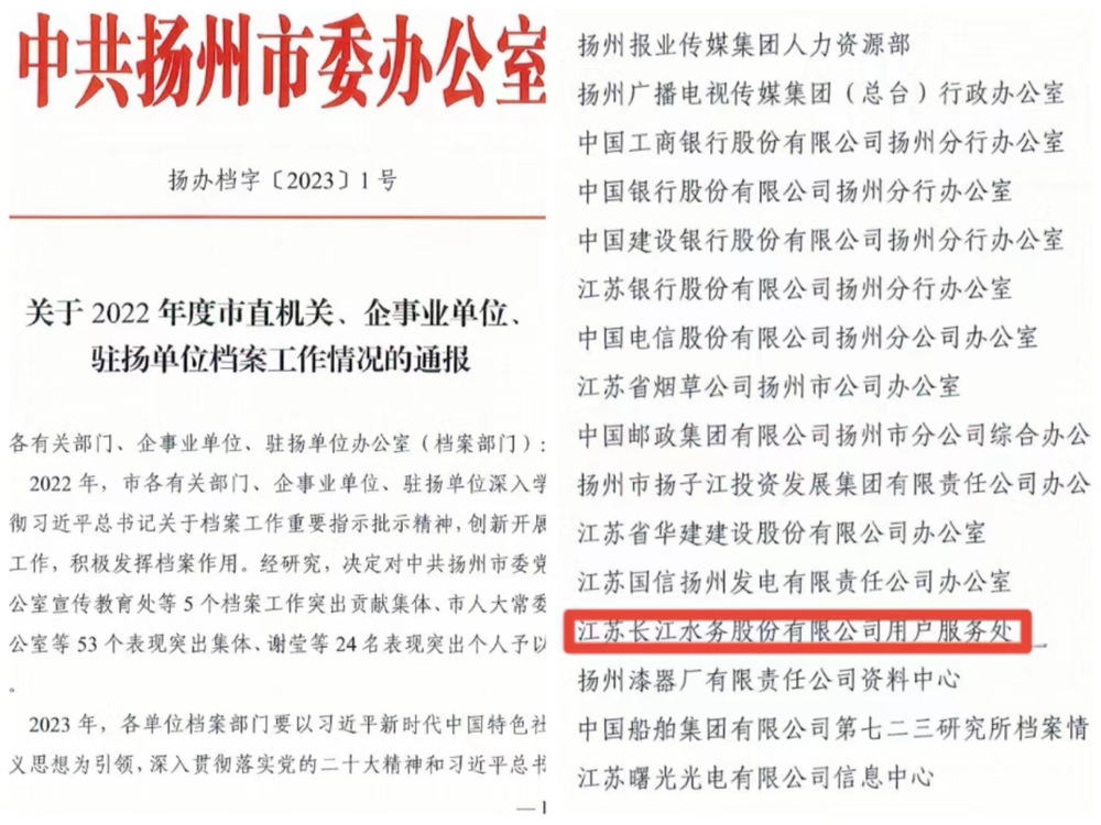 近日,長江水務公司用戶服務處獲得中共揚州市委辦公室頒發(fā)的“2022年度檔案工作表現(xiàn)突出集體”榮譽稱號。