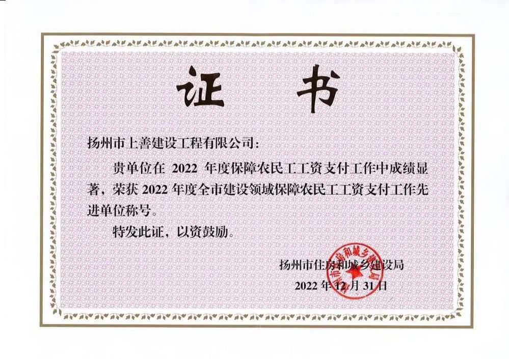 近日,上善公司榮獲2022年度全市建設(shè)領(lǐng)域保障農(nóng)民工工資支付工作先進(jìn)單位稱號。