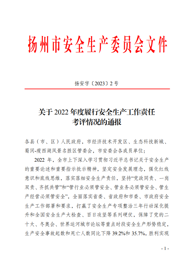2022年,城控集團深入貫徹落實習(xí)近平總書記關(guān)于安全生產(chǎn)重要思想論述,堅守“生命至上、安全發(fā)展”理念,全面落實安全生產(chǎn)責(zé)任,強化工作舉措,順利完成市安委會下達的目標任務(wù),被表彰為2022年度履行安全生產(chǎn)工作責(zé)任先進單位一等獎。