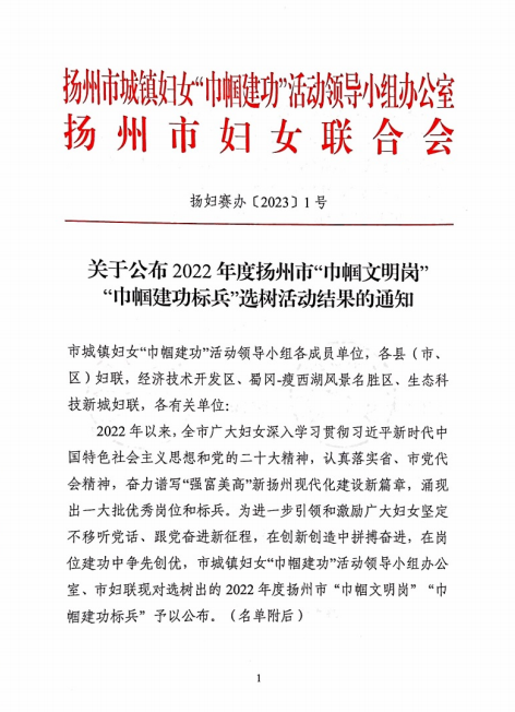近日,市婦聯(lián)、市婦女“巾幗建功”活動領(lǐng)導(dǎo)小組聯(lián)合表彰了一批揚州市“巾幗文明崗”和“巾幗建功標(biāo)兵”。揚州市政管網(wǎng)有限公司“890管網(wǎng)服務(wù)隊”榮獲“巾幗文明崗”稱號。