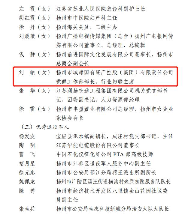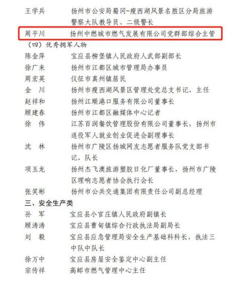 集團所屬揚州市政管網(wǎng)有限公司890管網(wǎng)服務隊獲評“巾幗模范集體”;集團黨群部部長、行業(yè)婦聯(lián)主席劉艷榮獲“巾幗榜樣”榮譽稱號;集團所屬揚州中燃城市燃氣發(fā)展有限公司黨群部主管周平川榮獲“優(yōu)秀退役士兵”榮譽稱號;集團企管部副部長李剛榮獲“安全生產(chǎn)類先進個人”榮譽稱號。