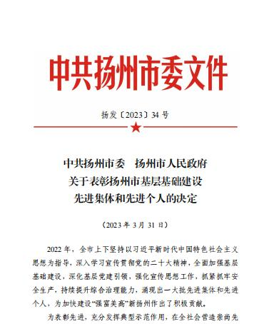 近日,揚州市委、市政府發(fā)布《關(guān)于表彰揚州市基層基礎建設先進集體和先進個人的決定》,表彰了過去一年在“強富美高”新?lián)P州建設中,在加強基層基礎建設、深化基層黨建引領(lǐng)、強化宣傳思想工作、抓緊抓牢安全生產(chǎn)、持續(xù)提升綜合治理能力等多個方面涌現(xiàn)出的一批銳意進取、改革創(chuàng)新、勇于擔當、善于作為的先進集體和先進個人。