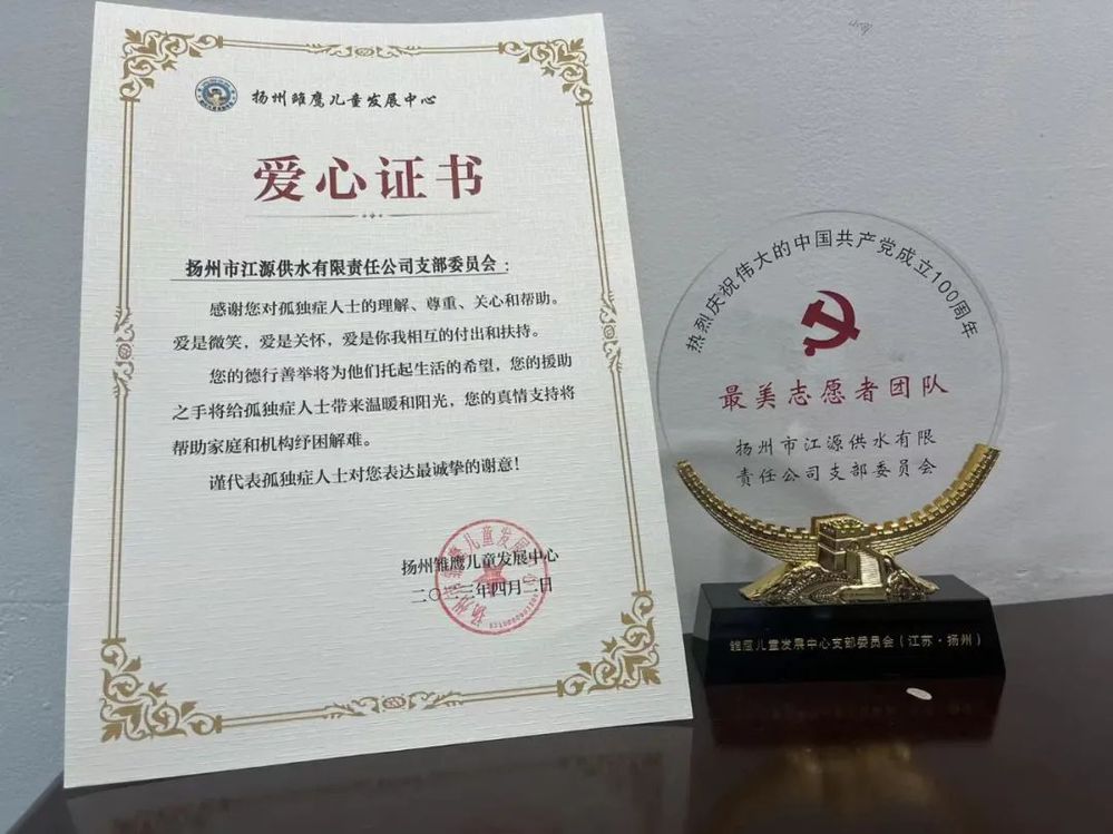 日前,長(zhǎng)江水務(wù)江源公司“561”供水服務(wù)隊(duì)榮獲揚(yáng)州市殘聯(lián)雛鷹兒童發(fā)展中心送來的愛心證書,感謝“561”供水服務(wù)隊(duì)的幫扶和服務(wù),并授予其“最美志愿團(tuán)隊(duì)”稱號(hào)。