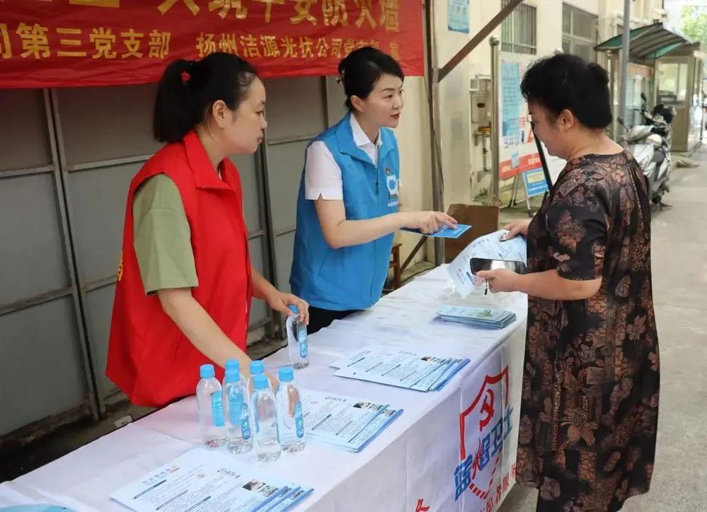 為充分發(fā)揮黨組織戰(zhàn)斗堡壘和黨員先鋒模范作用,進一步普及用電、用氣安全知識,7月24日上午,潔源光伏公司黨支部聯(lián)合揚州中燃公司第三黨支部前往石橋社區(qū)嘉豐苑小區(qū)開展“安全宣傳進社區(qū),共筑平安防火墻”志愿服務(wù)活動。