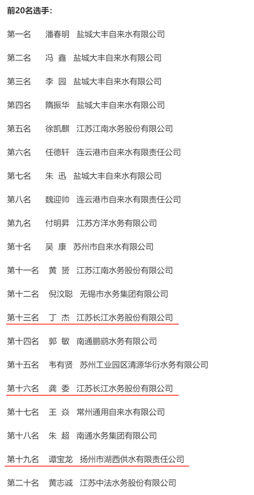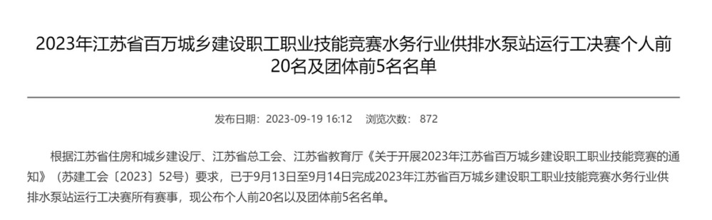 近日,江蘇省住房和城鄉(xiāng)建設(shè)廳公布了“2023年江蘇省百萬(wàn)城鄉(xiāng)建設(shè)職工職業(yè)技能競(jìng)賽水務(wù)行業(yè)供排水泵站運(yùn)行工決賽”個(gè)人前20名及團(tuán)體前5名名單。長(zhǎng)江水務(wù)選手在全省近百名參賽選手的激烈角逐中表現(xiàn)出色、取得佳績(jī),丁杰、龔委、譚寶龍位列個(gè)人成績(jī)前20名,均榮獲“優(yōu)秀選手”稱號(hào),其他選手也正常發(fā)揮取得較好排名,揚(yáng)州代表隊(duì)榮獲團(tuán)體總分第5名。