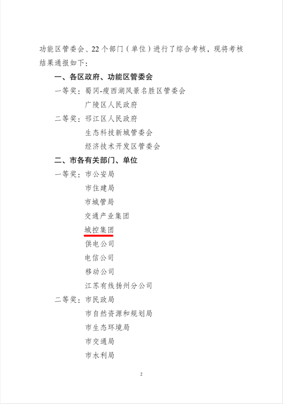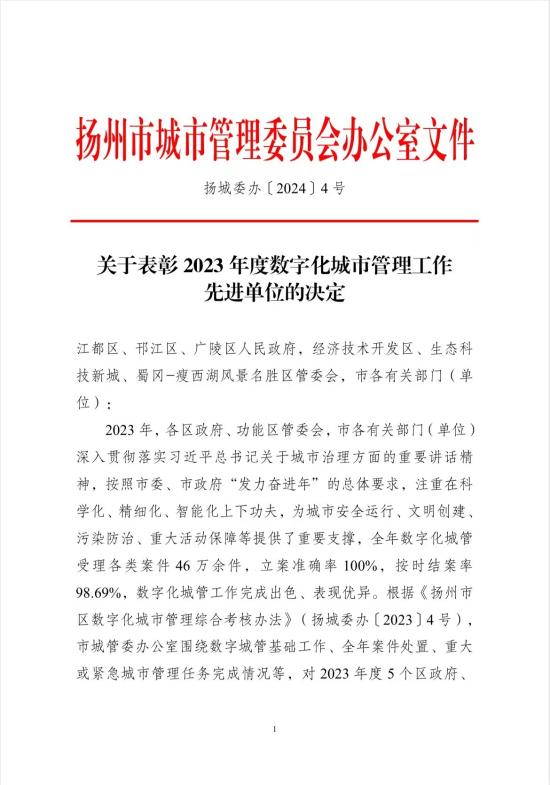近日,揚(yáng)州市城市管理委員會辦公室發(fā)布《關(guān)于表彰2023年度數(shù)字化城市管理工作先進(jìn)單位的決定》,城控集團(tuán)榮獲“2023年度數(shù)字化城市管理工作先進(jìn)單位”一等獎。