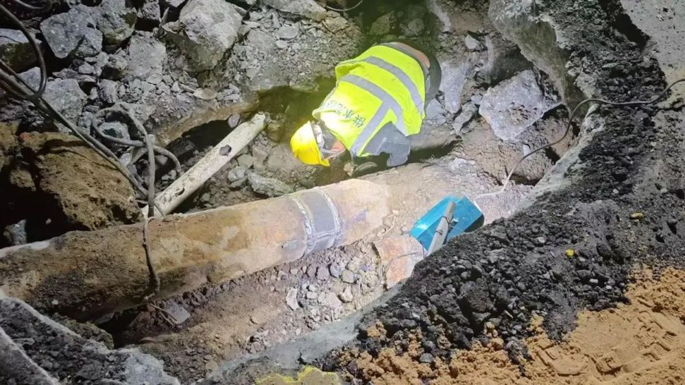 初冬季節(jié),此時(shí)晚上室外氣溫在5度左右。挖掘好深達(dá)2米的深坑后,工作人員開始實(shí)施堵漏。這次漏損點(diǎn)是鋼管變形造成焊縫斷裂達(dá)5厘米,由于地下管線異常復(fù)雜,有強(qiáng)電纜、還有弱電電纜交叉,有些地方搶修人員只能用鐵鍬或徒手清理出管道維修口。損壞管道清理出來后,發(fā)現(xiàn)只能用焊接修復(fù)的方法進(jìn)行維修,再次增加了搶修的難度及時(shí)長,但搶修人員沒有后退,穩(wěn)扎穩(wěn)打,立即進(jìn)行切割、補(bǔ)縫焊接,最終經(jīng)過6個(gè)小時(shí)的不懈努力,受損管道于夜里11點(diǎn)之前成功修復(fù),供水恢復(fù)正常。