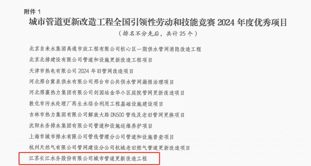 此次長江水務(wù)在全國燃?xì)?、供水、排水、供熱行業(yè)競賽中榮獲“城市管道更新改造工程全國引領(lǐng)性勞動和技能競賽2024年度優(yōu)秀項目”,成為江蘇省內(nèi)唯一獲此殊榮單位。這不僅是對其在城市供水管道更新改造工程中所取得成就的肯定,更是對全體職工辛勤工作和專業(yè)精神的高度贊揚。未來,長江水務(wù)將繼續(xù)秉持“服務(wù)民生、保障供水”的宗旨,為揚州城市供水事業(yè)的發(fā)展做出更大的貢獻。