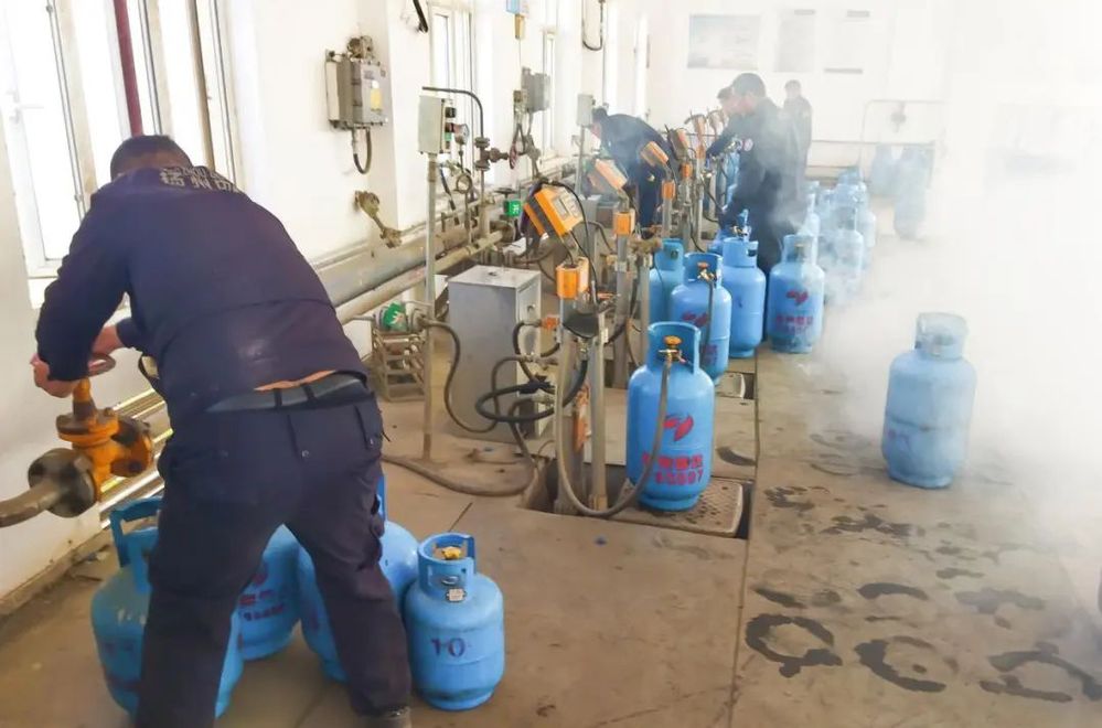 本次演練模擬LPG充裝臺軟管崩脫造成泄漏情況下的應(yīng)急處置。5號充裝秤的充裝軟管突然崩脫,大量液化氣泄漏并向周圍擴散。灌裝人員立即報告當(dāng)班班長,班長迅速關(guān)閉灌裝總閥,組織作業(yè)人員迅速有序撤離充裝臺,同時報送場站負(fù)責(zé)人;場站負(fù)責(zé)人立即安排門衛(wèi)在場站入口處實施警戒,禁止無關(guān)人員進(jìn)入,同時通知維修人員趕赴現(xiàn)場處置。