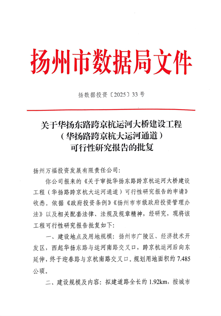 華揚東路跨京杭運河大橋建設(shè)工程是2025年揚州市級政府投資計劃的重點項目,是揚州城區(qū)二十五橫十七縱主干路網(wǎng)的關(guān)鍵節(jié)點。項目建成后將有效緩解區(qū)域交通擁堵,形成更為完善的跨河交通體系,為沿線產(chǎn)業(yè)布局優(yōu)化和城市空間拓展提供有力支撐。
