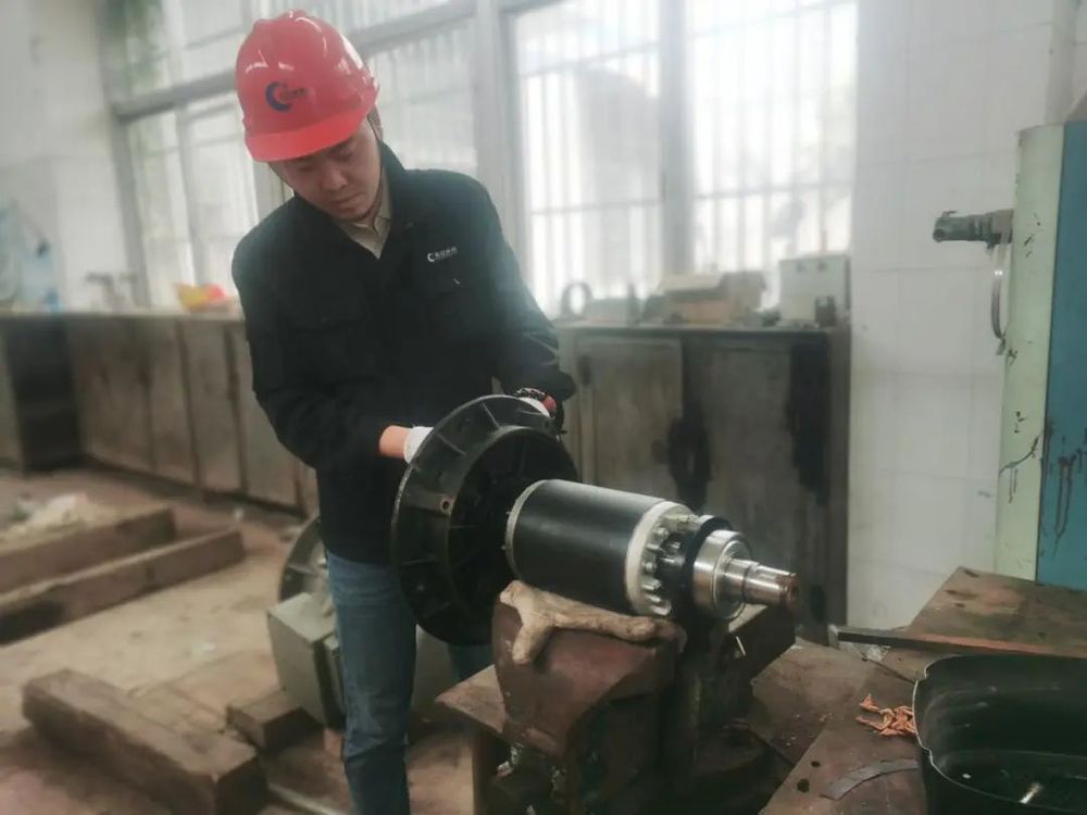 拆卸過(guò)程中,技術(shù)人員面臨安裝位置狹窄、操作空間有限等問(wèn)題,但他們毫不退縮,憑借精湛技術(shù)及頑強(qiáng)毅力,順利完成故障電機(jī)拆卸工作。故障電機(jī)運(yùn)抵修理車間后,技術(shù)人員爭(zhēng)分奪秒更換新軸承,并連續(xù)奮戰(zhàn)24小時(shí)完成維修,隨后對(duì)2號(hào)水泵葉輪等關(guān)鍵部件進(jìn)行全面調(diào)試。最終,2號(hào)水泵恢復(fù)平穩(wěn)運(yùn)轉(zhuǎn),清澈水流重新輸送至文昌府居民家中。