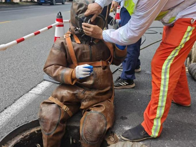 對于井室和管道內(nèi)存在的大塊水泥和混凝土,常規(guī)方法難以清除,只能通過人工下井清掏。穿上厚重的防護服、戴上防毒面具、系好安全繩,相榮慢慢降入井中。管道內(nèi)悶熱潮濕、空氣混濁?!熬聹囟缺鹊孛孢€高,像蒸桑拿。”在直徑僅700mm的井室內(nèi),相榮用風鎬將水泥塊打碎,并用小桶將打碎的水泥碎塊裝進去,再由井上面的輔助人員一桶一桶的拎上來,并及時裝入垃圾袋,當天集中清運。經(jīng)過兩個小時的奮戰(zhàn),他們終于疏通了這段兩米多長的堵塞管道。當相榮被上面兩個輔助人員通過三腳架及安全繩拉上來時,汗水濕透了他的衣服。