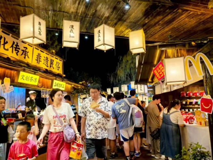 露天啤酒花園內(nèi),精釀啤酒與揚(yáng)州老鵝、臭干等本地小吃組成奇妙CP,引得游客紛紛駐足。當(dāng)夜幕降臨,千米長的東關(guān)街燈火通明,“千里照壁燈”景觀與啤酒節(jié)的璀璨燈光交相輝映,真正實(shí)現(xiàn)“晝夜皆景、越夜越美”的消費(fèi)新格局。