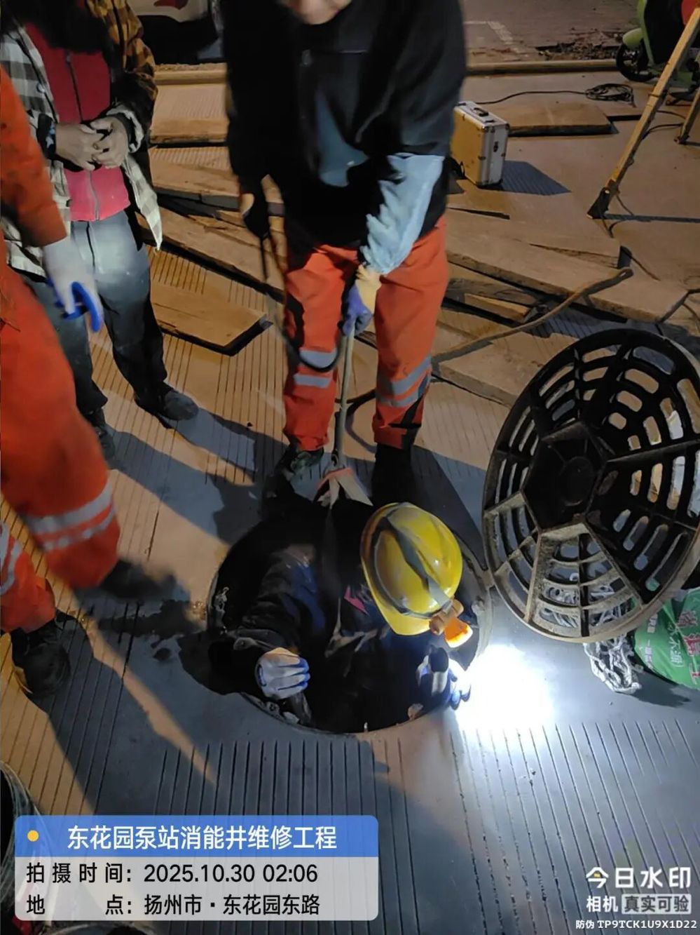 施工期間,工人們默契配合。地下有限空間內(nèi),老師傅劉工一邊仔細地進行密封加固,一邊向年輕工友傳授經(jīng)驗:“這種防水處理要像繡花一樣精細,一道工序不到位,就可能前功盡棄。”而在井外,降噪措施也同步實施,工人們輕拿輕放工具,低聲交流,生怕打破夜的寧靜。原本計劃的夜間施工任務(wù),僅用一個半小時便高效完成,較預(yù)期大幅縮短工期。
